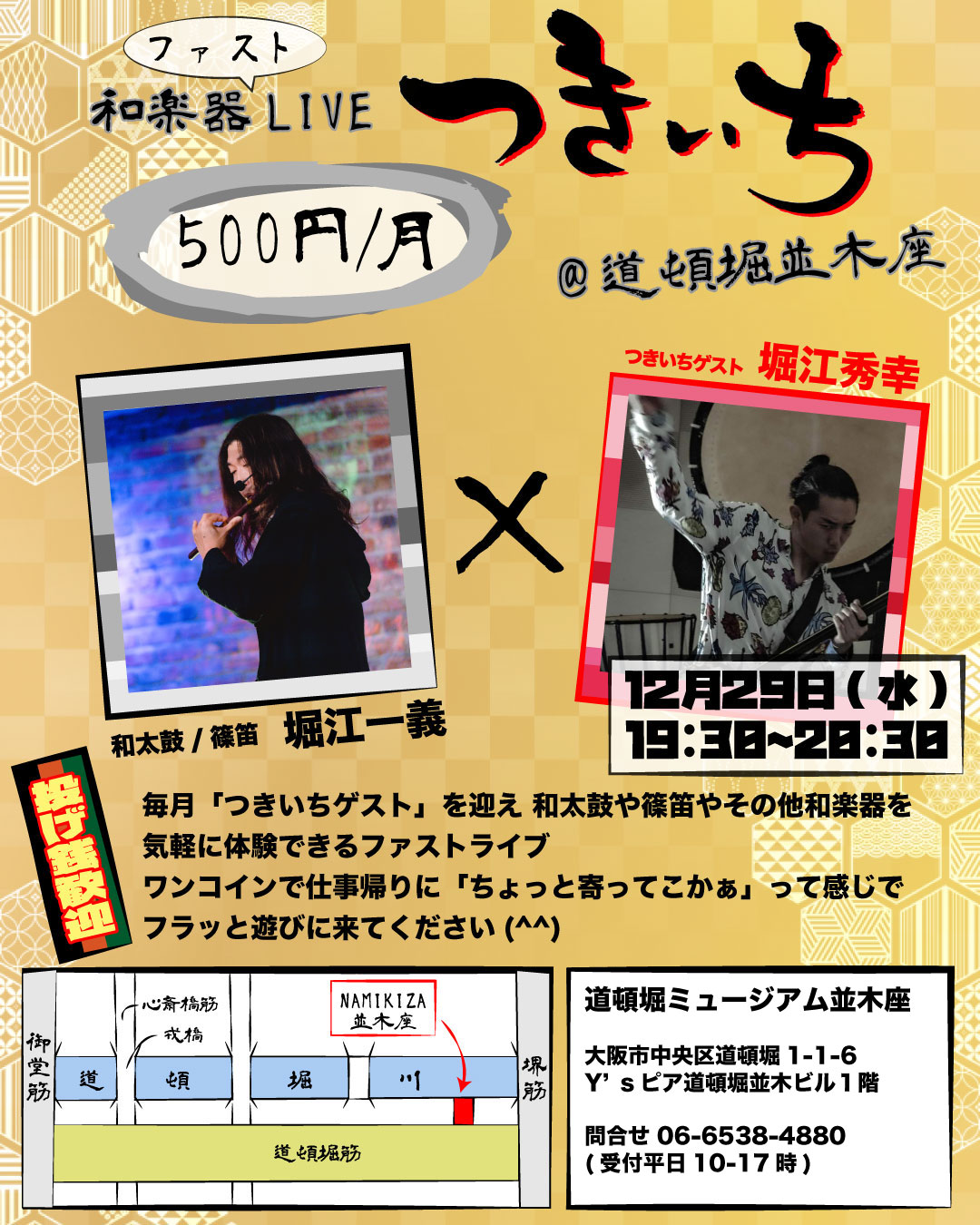 和楽器LIVEつきいち 2021年 12/29(水) 19:30開演 和太鼓/篠笛 堀江一義 つきいちゲスト 堀江秀幸 500円/月! (+投げ銭歓迎)