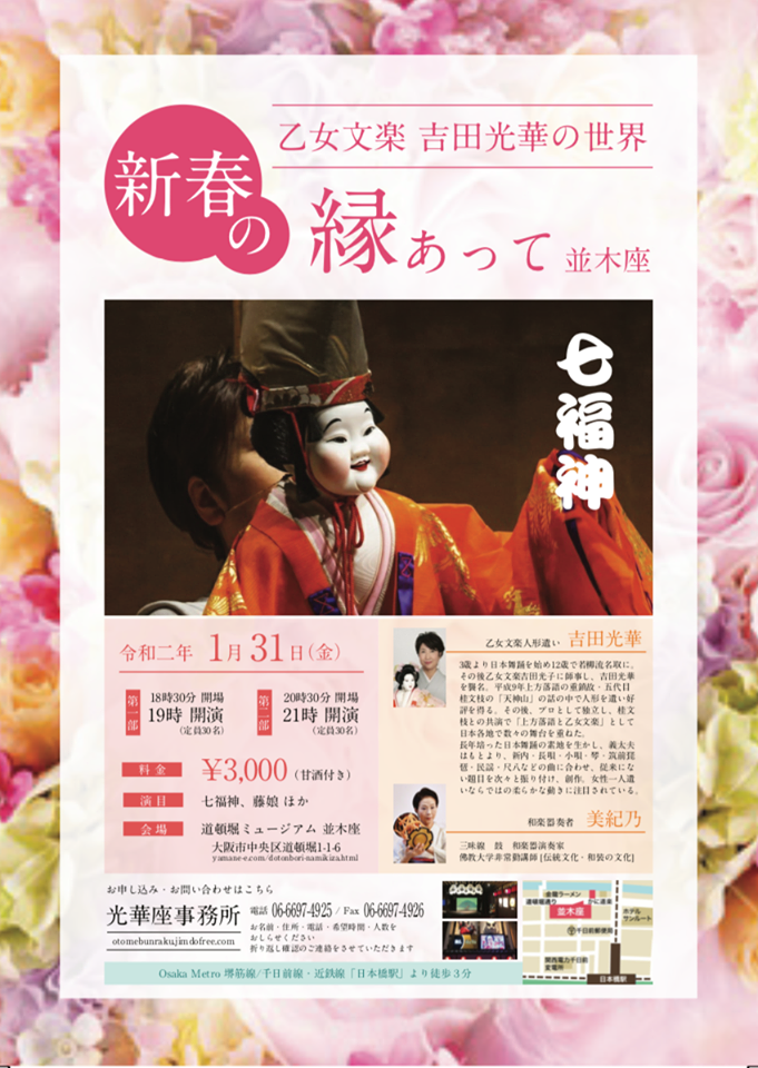 | コロナ禍で人が居なくなった道頓堀を元気づけるため 野澤松也師匠と毎月開催してきました 道頓堀賑やかし浄瑠璃ライブ 1/28(金)は中止。2/28(月)15時、18時は入場無料・投げ銭歓迎スタイルで催行します!ので、お楽しみにお願い申し上げます。 | ||||||||||