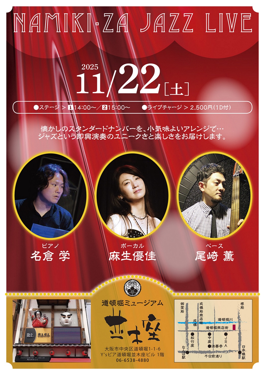 NAMIKI・ZA JAZZ LIVE 懐かしのジャズスタンダードナンバーを、小気味良いアレンジで・・・ ジャズという即興演奏のユニークさと楽しさをお届けします。 ヴォーカル:麻生優佳 オルガン:竹田利恵 ギター:竹田昌也 10/25(土) STAGE1 14:00〜 STAGE2 15:00〜 入れ替え無し 2,500円(ワンドリンク付き) ズーム視聴 500円(要事前申込・お支払い) |