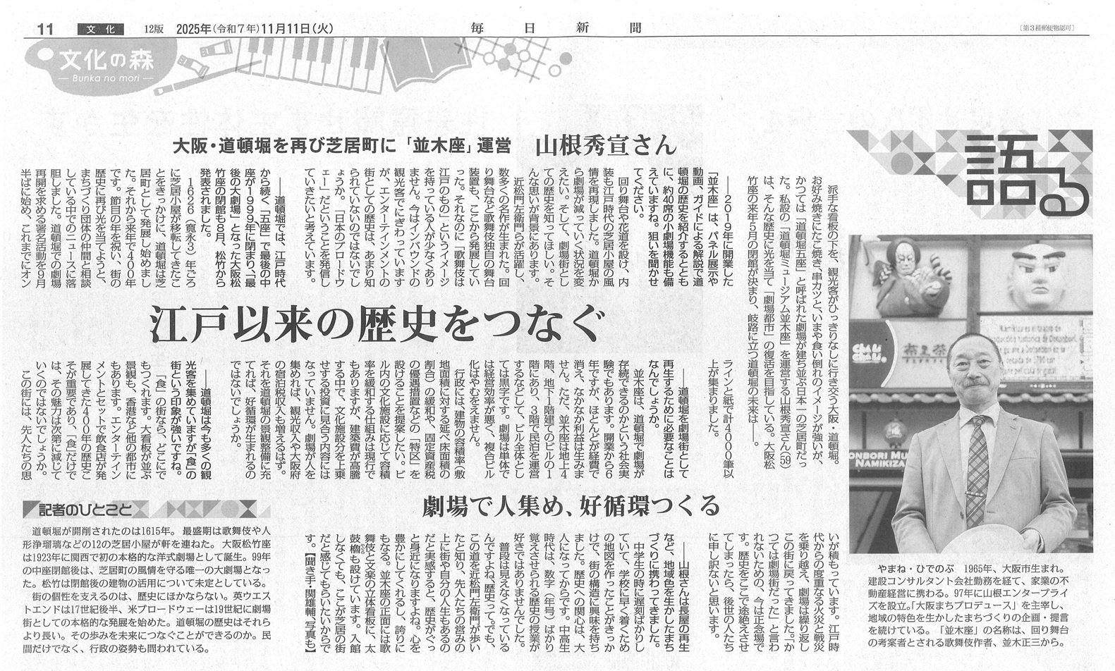 2025/10/26 日経新聞(全国版)文化時評「近松門左衛門が泣いている 回り舞台発祥の地、大阪・道頓堀から劇場文化の灯火を消さない方策が不可欠」