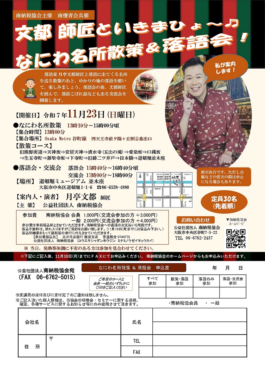 文都師匠といきまひょ?♪ なにわ名所散策&落語会! ●なにわ名所散策 13:10〜15:00 【集合時間】13:00 【集合場所】大阪メトロ谷町線四天王寺前夕日丘駅4番出口 【散策コース】 旧熊野街道⇒天神坂⇒安居天神⇒清水寺(玉手の滝) ⇒愛染坂⇒口縄坂⇒生玉寺待ち⇒源聖寺⇒下寺町 ⇒旧跡二ツ井戸⇒日本橋⇒道頓堀並木座 ●落語会・交流会 落語会 15:40〜16:40 交流会 17:00〜18:00 【場所】道頓堀ミュージアム並木座 【案内役・演者】月亭文都 師匠