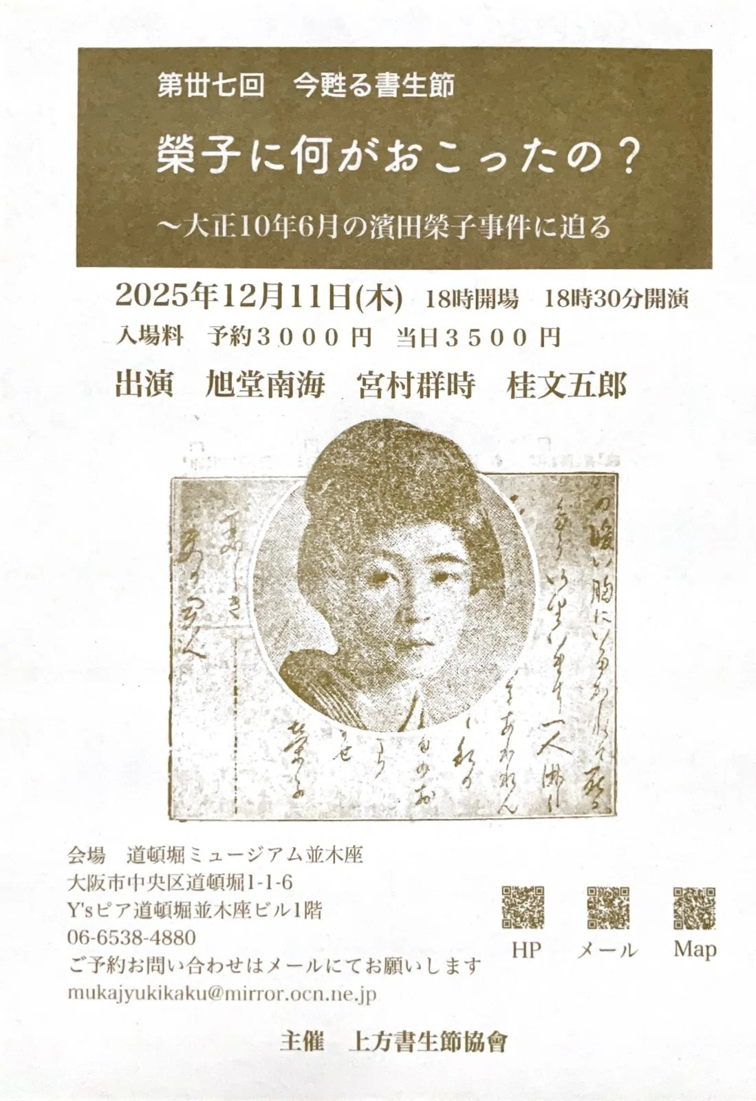 開演 18:30 (開場18:00) 入場料 予約3,000円 当日3,500円 出演 旭堂南海 宮村郡時 桂文五郎 ご予約・お問い合わせ:上方書生節協會